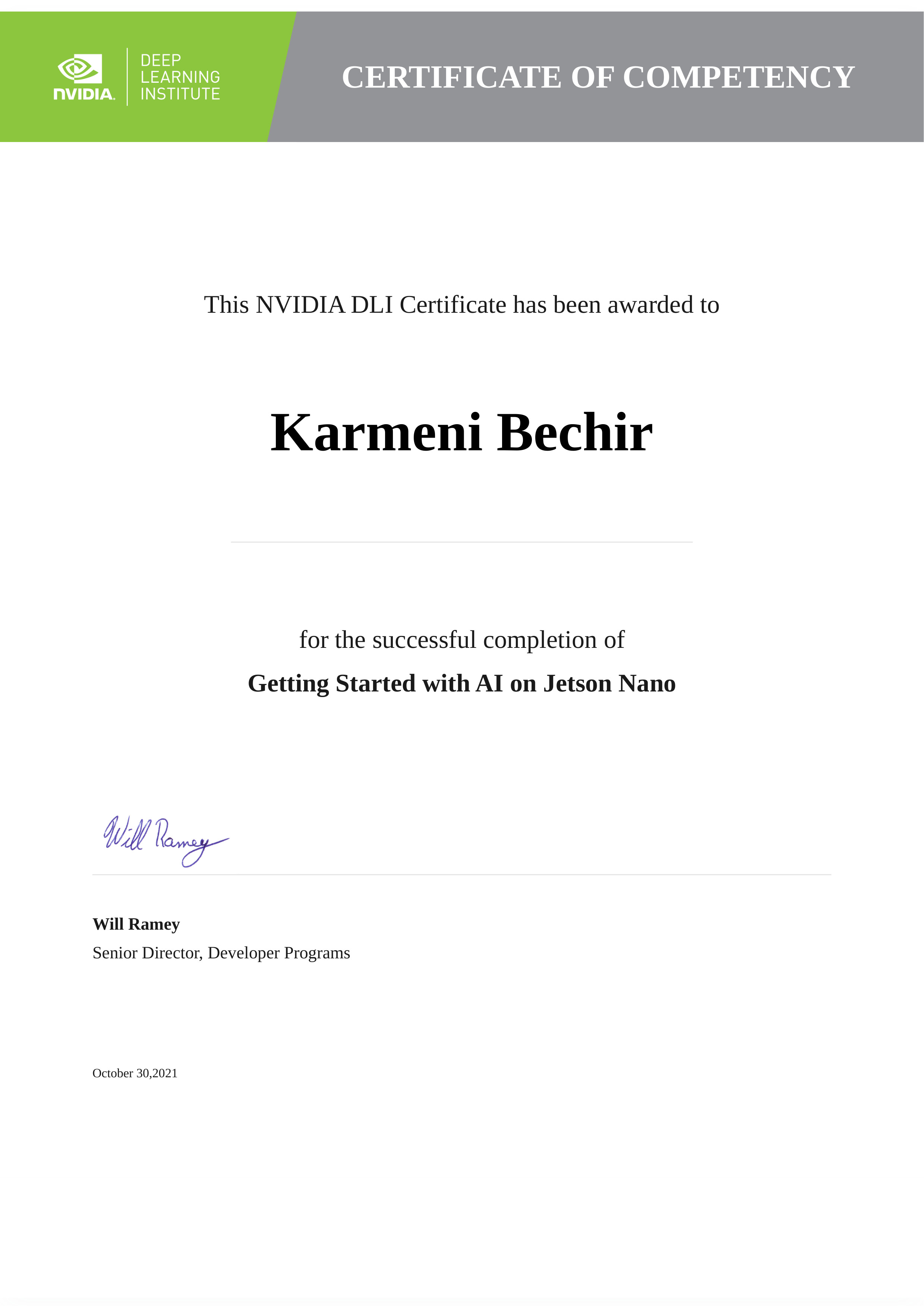 This certificate acknowledges proficiency in the foundational concepts and practical applications of Artificial Intelligence, specifically on the Jetson Nano platform. It signifies a strong foundation in AI and its implementation on specialized hardware, making it a valuable credential for those venturing into the world of AI and edge computing.