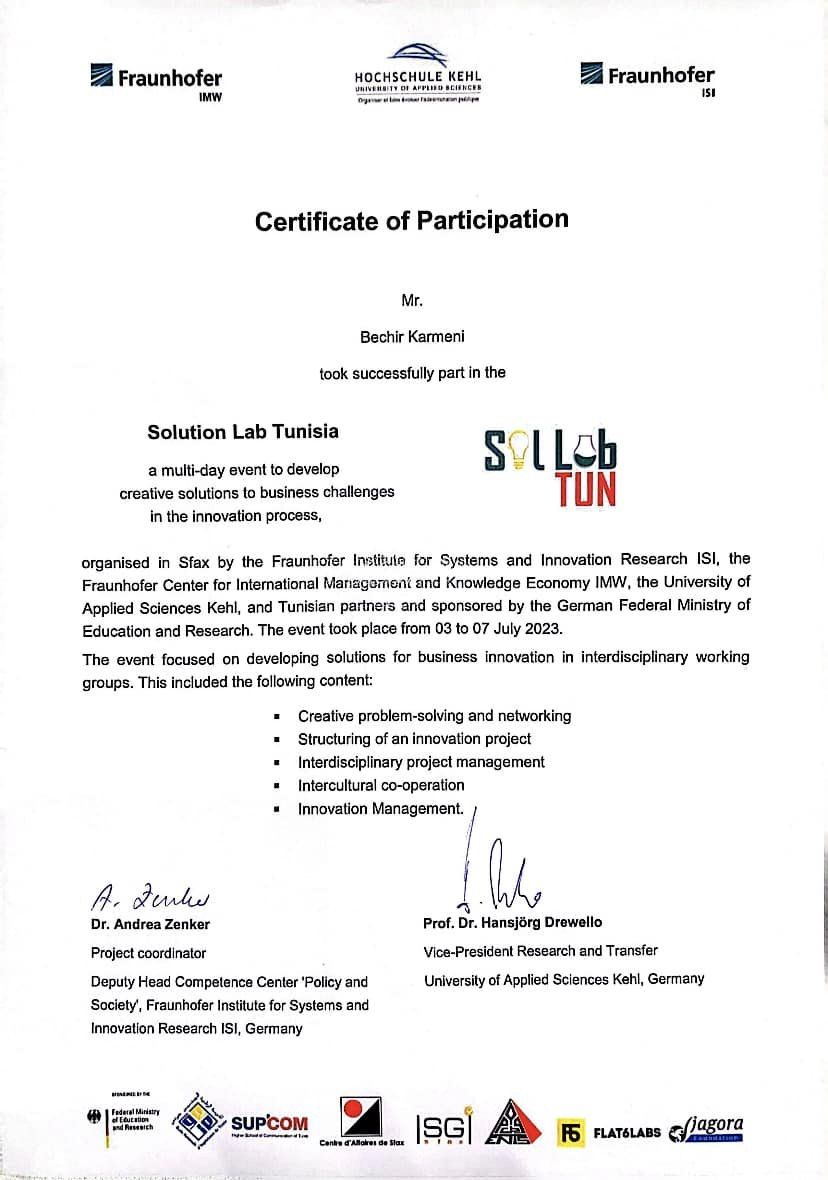 This exceptional training was organized by Fraunhofer Center for International Management and Knowledge Economy IMW , Fraunhofer Institute for Systems and Innovation Research ISI , Hochschule für öffentliche Verwaltung Kehl , Federal Ministry of Education and Research, Germany and Tunisian partners