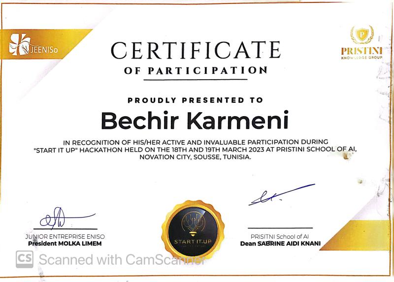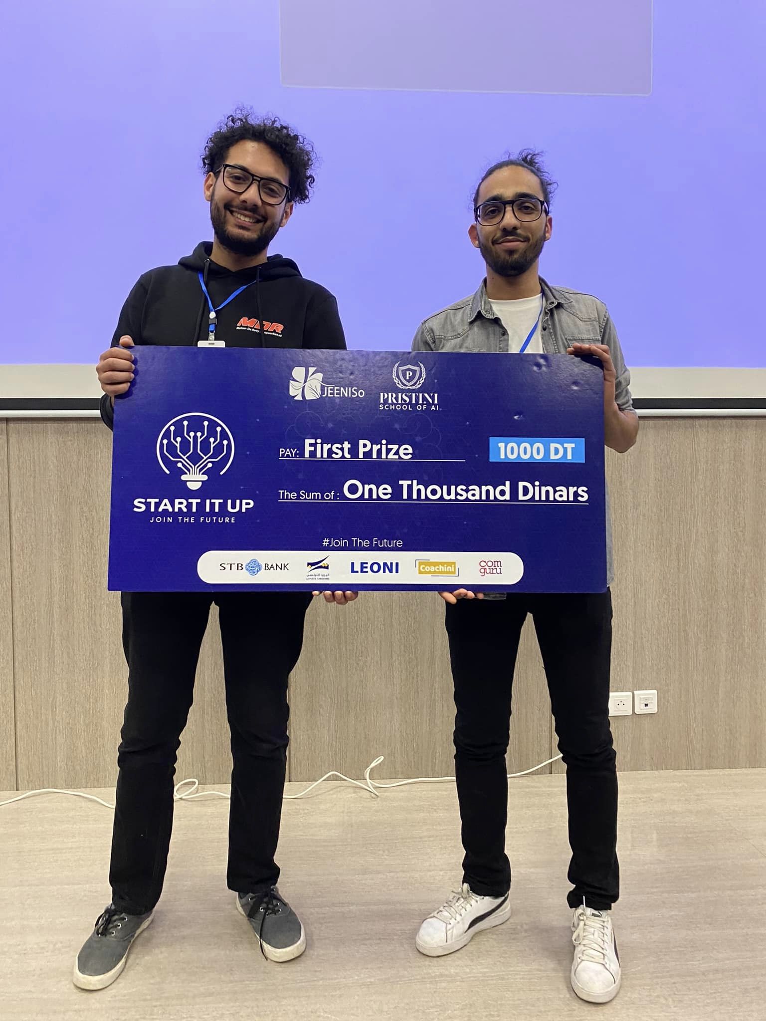 I am thrilled to share with you all that my friend Koussay Messaoudi and I emerged as the first prize winners in the highly competitive Start It Up Hackathon organized by Junior Entreprise ENISo! This was an incredible opportunity for us to showcase our skills and creativity in a 24-hour Hackathon where teams competed to create and develop cutting-edge projects around Artificial Intelligence. Working alongside Koussay was an amazing experience, and I cannot express enough how much I enjoyed collaborating closely with him to develop a solution that we believed would impress the judges. We put in a lot of hard work, and it was truly inspiring to see the other participants' ideas and be part of such a talented and driven group. Winning this hackathon is a huge milestone for us, and it has given us a significant boost of confidence and inspiration to pursue our entrepreneurial goals even further. We are excited about the possibilities that this achievement has opened up for us and are eager to continue to innovate and create
